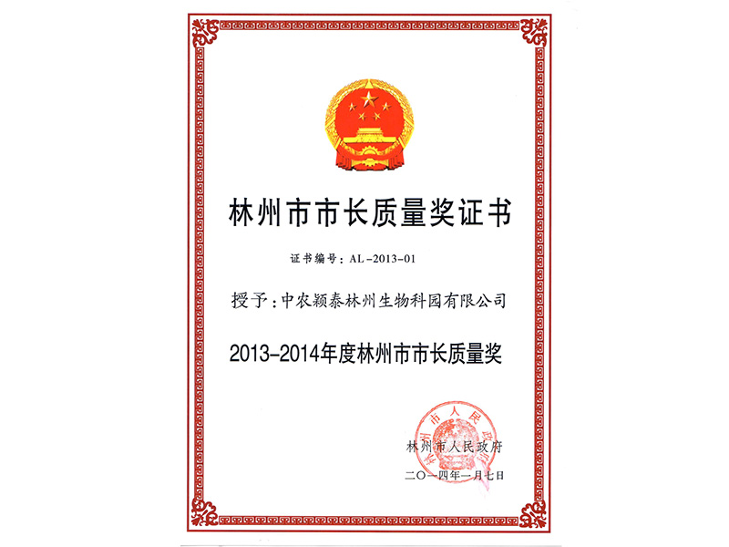 林州市市長(zhǎng)質(zhì)量獎(jiǎng)證書(shū)