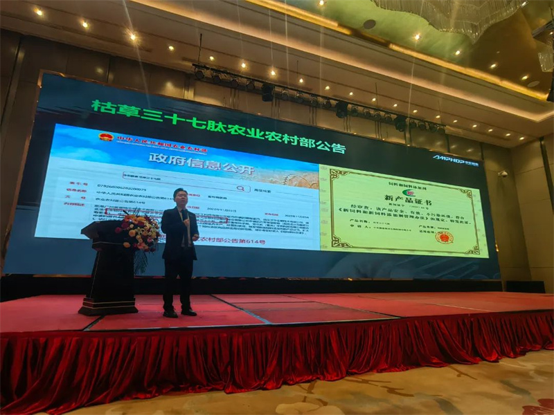 中農穎泰集團副總經理劉揚科博士出席會議,并做題為國家新飼添-枯草三十七肽的精彩報告,劉博士首先介紹了枯草三十七肽的研究歷程,及國家新飼添的申報歷程,集團數十年專注于抗菌肽的艱苦研發,終于獲得國家首個抗菌肽新飼添證書,開創了抗菌肽應用研發新紀元!劉博士詳細闡述了抗菌肽的作用機制、現場應用效果。在水產上,抗菌肽具有促進生長、修復腸道、提高免疫力增加成活率等作用,中農穎泰抗菌肽水產飼料產品成分明確、安全合法可檢測、效果顯著廣泛使用。